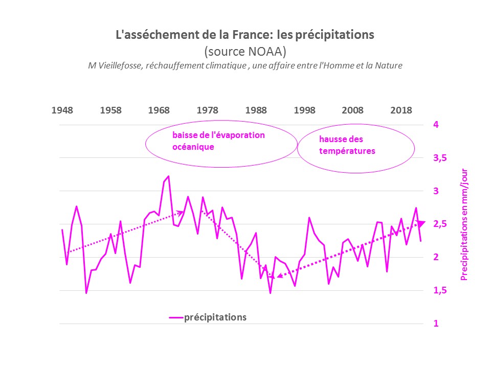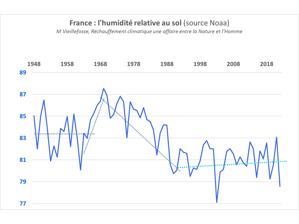 Aujourd’hui, les précipitations sont revenues à leur valeur de 1960, mais avec une température plus élevée, et donc une humidité relative plus faible. Nous subissons une sécheresse plus marquée que sur l’ensemble du globe. Nous observons une réduction de 7 % de l’humidité relative au sol, et dans l’atmosphère. Le blocage de l’évapotranspiration au sol à partir de 1990 freine l’humidification de l’atmosphère, lui interdisant de rejoindre le niveau lié habituellement à l’augmentation de température.